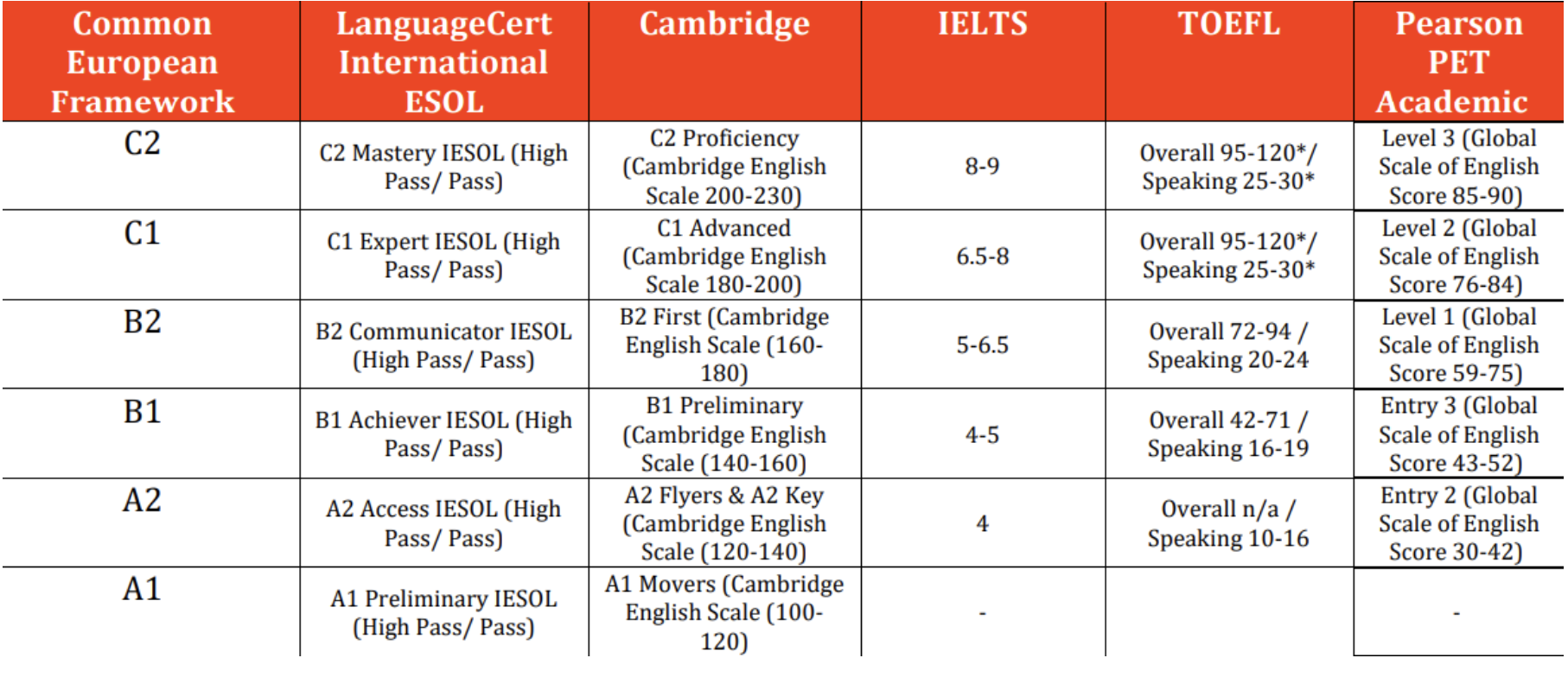 Соответствие Pass/High Pass за каждый уровень баллам IELTS, TOEFL, PET и экзаменам Кембриджа - приблизительно следующее: