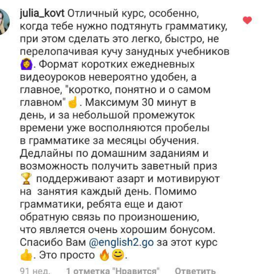 Ребята, вы, как всегда, молодцы Доступная грамматика, авторский подход. Нравится возможность пересматривать уроки. Ну и формат видеоуроков лично для меня удобен. Вообще, весь процесс построен настолько ненапряжно, что даже дедлайны не пугают. Спасибо, не жалко ни одной потраченной копейки!