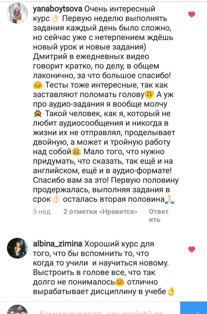 Спасибо огромное всей команде за такой удачный формат. Мне нравятся все ваши лекции и интенсивы, но этот получился выше всех моих ожиданий. Это был волшебный пинок, заставивший меня заниматься английским каждый день. Буду ждать следующих проектов.