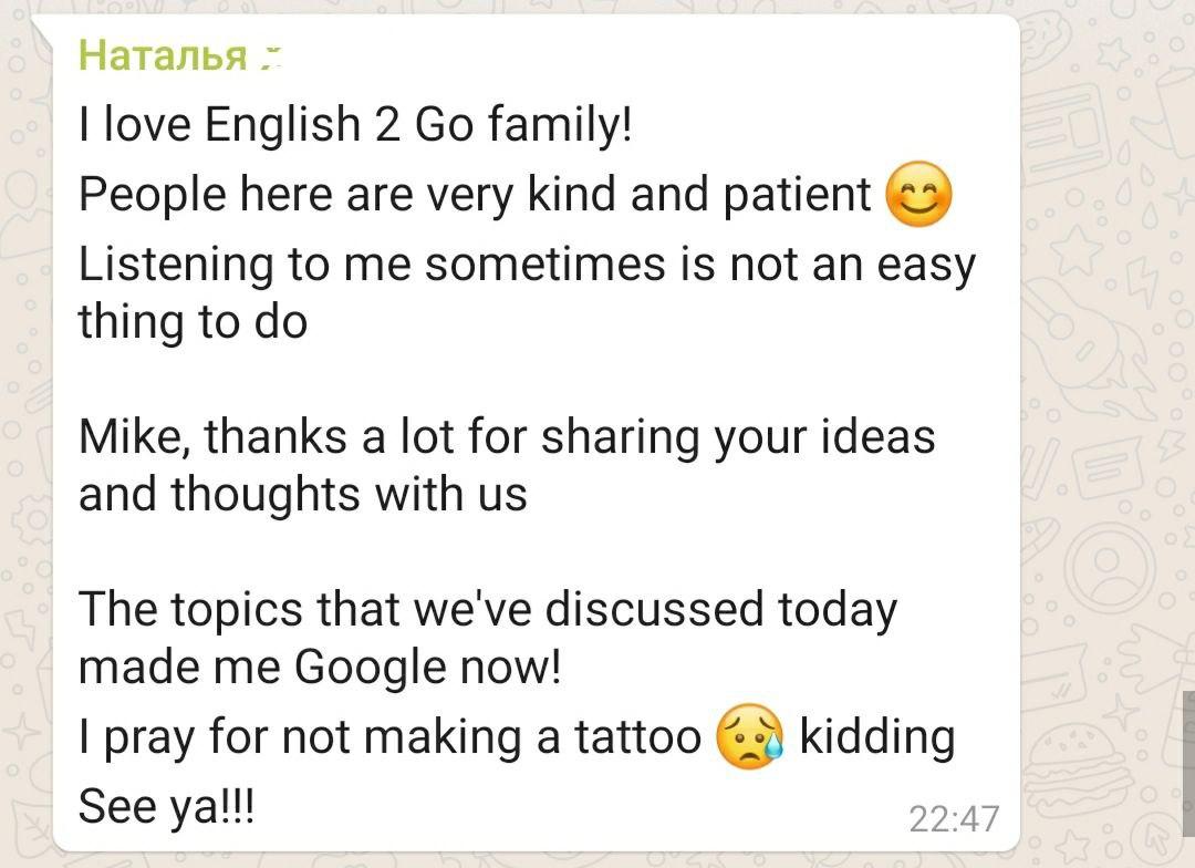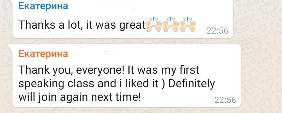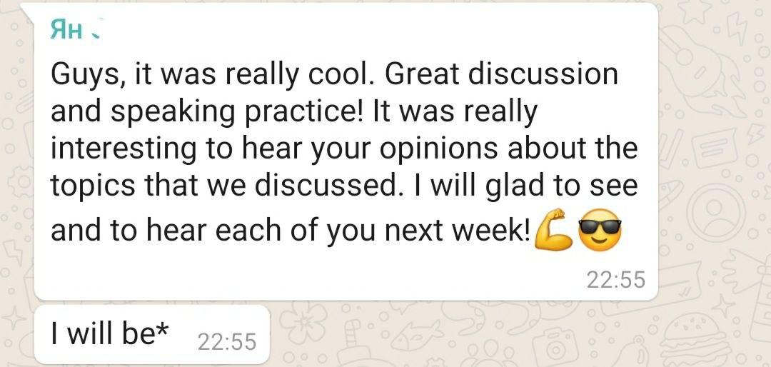 Мы рекомендуем этот разговорный клуб всем, кто достиг уровня Intermediate и выше. Иногда нужно немного адаптироваться к речи собеседника, как в обычной жизни.