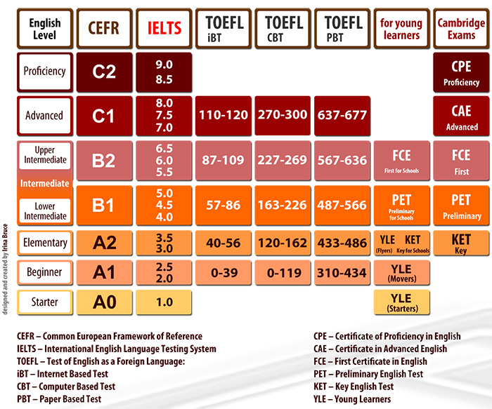 На уровне B2 вы сможете сдать IELTS на 5,5 - 6,5 - этого достаточно для многих иммиграционных программ. B1 соответствует результату от 4 до 5, а уровень A2 позволяет набрать не более 4 баллов. Что касается уровня A1, на нём сдача IELTS нецелесообразна.